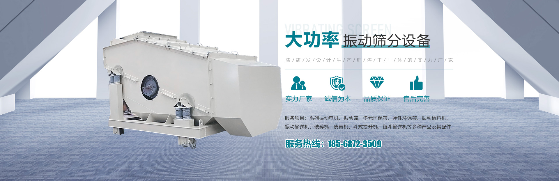 - 主要產(chǎn)品有系列振動電機、振動篩、多元環(huán)保篩、彈性環(huán)保篩、振動給料機、振動輸送機、破碎機、皮帶機、斗式提升機、鏈斗輸送機等多種產(chǎn)品
